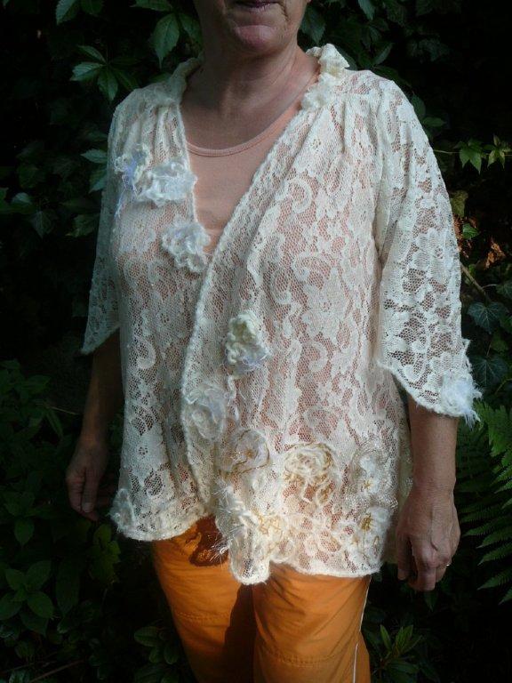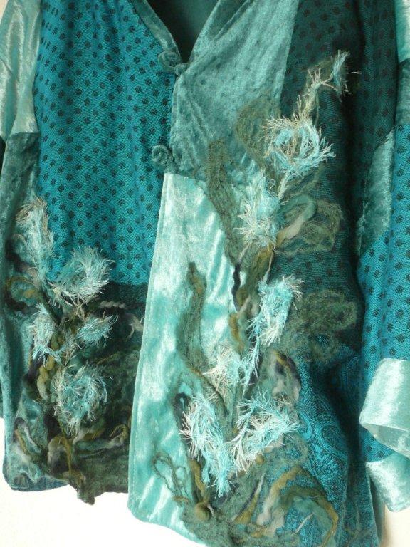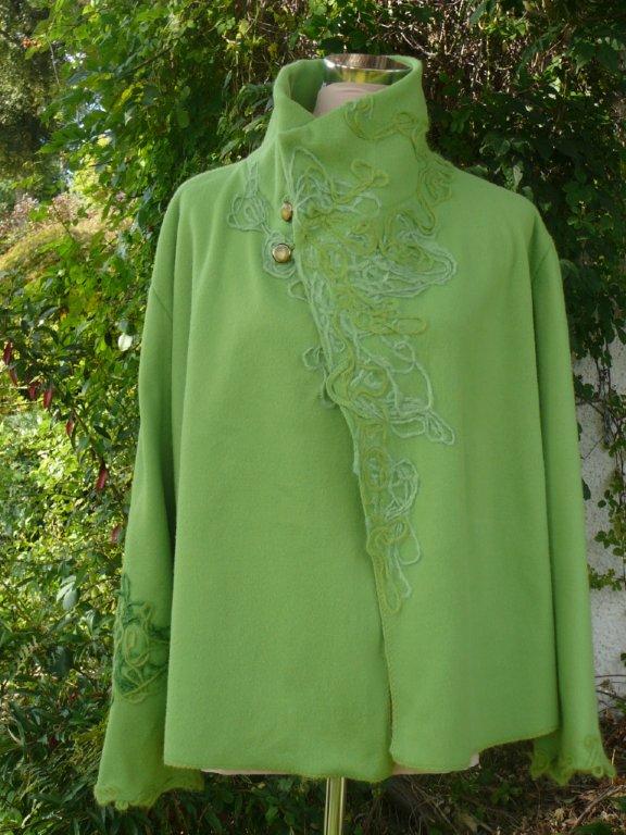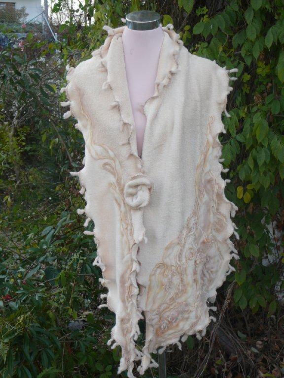 barockes Olive Aufbruch 41 Stoff: leichter Fleece, 100%Polyester (Tagesdecke) Vorderkante eine Seite leicht schräg geschnitten, Halspartie und Ärmelstösse sind innen und aussen mit Wollfäden verfilzt, d.h. Kragen/Jacke kann in vielen Varianten getragen werden(hoher Stehkragen, Kragen teilweise umgeklappt, einseitig oder beidseitig offen, Ärmel umgeschlagen oder bis zur Handmitte ...) Strickwolle: mit Kidmohair Grösse ca. 40-44 weitere Bilder ..... |
