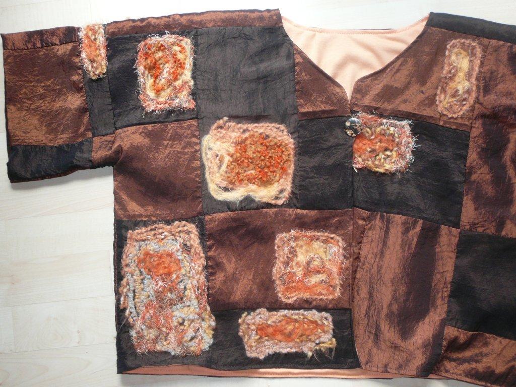 Zellen Aufbruch 07 Stoff: Patchworkstoff aus Polyester(fertig gekauft) in dunkelbrauntönen, Innenseite gefüttert mit feinem orangenem Baumwolljersey , Ärmel-innenseite wie -aussenseite (Stoff doppelt) Strickwolle: Diverse Materialien Grösse bis ca. 46 Länge: 50 Breite mit ausgebreiteten Ärmeln: 103 weitere Bilder ..... |
