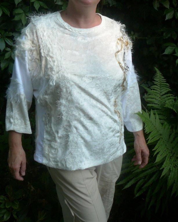 Gold&Silber Aufbruch 11 Stoff: Baumwollsweatshirt und Pannesamt Strickwolle: Diverse Materialien, Gold- und Silberbänder weitere Bilder ..... |