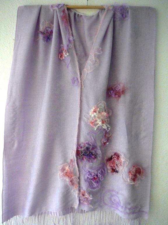 lila Pfingstrosen Aufbruch 18 Schal-Gilet: 70% Pashima, 30%Silk, lila Strickwolle: Diverse Materialien weitere Bilder ..... |