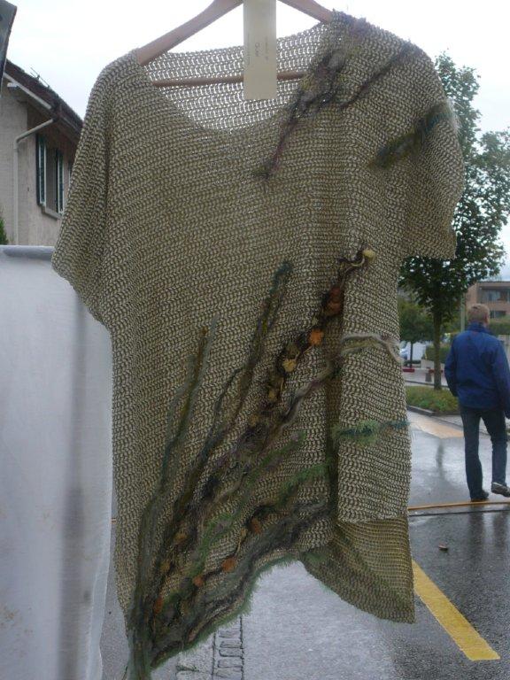 Feuerwerksnacht Aufbruch 44 Stoff: Fleece-Tagesdecke, 100% Polyester, dunkelgrau-schwarz gerader einfacher Schnitt,weite gerade Ärmel, Innenseite Vorder-&Hinterteil gefüttert mit weinrotem Pannesamt Strickwolle: Diverse Materialien, Wolle, Filzwolle Grösse bis ca. 48, Länge: 55, Breite mit ausgebreiteten Ärmeln:110 weitere Bilder ..... |