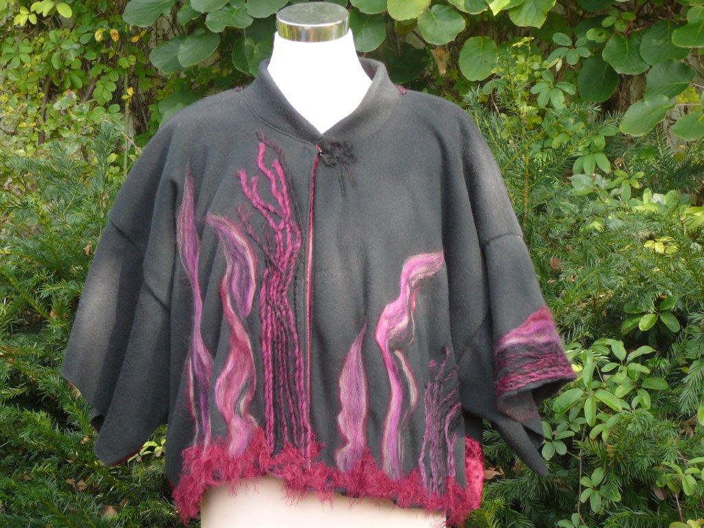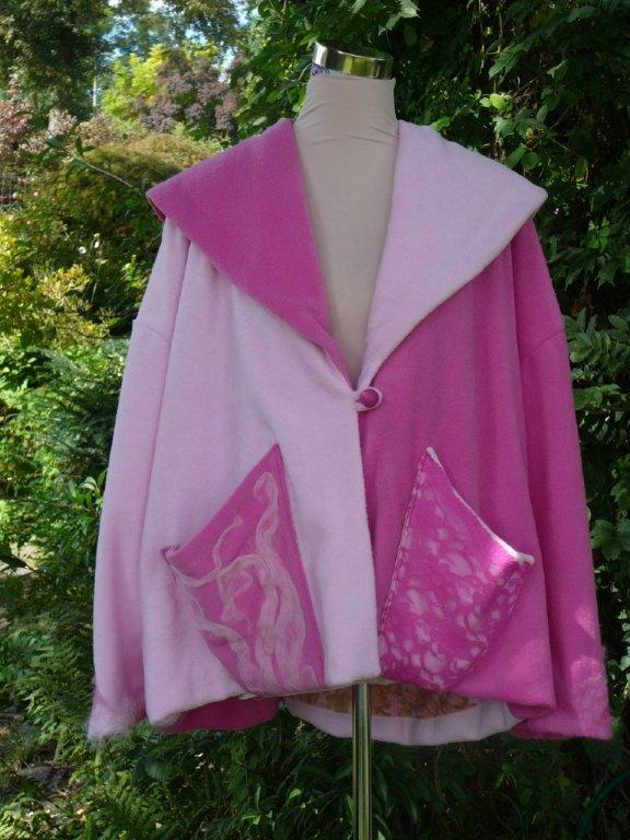 Pink Harlekin Aufbruch 39 Stoff: Fleece, 100% Polyester, Futter Viscose mit Elastan weit geschnittener Kurzmantel, breiter Schalkragen mit vielen Tragevarianten, 2 grosse leicht abstehende Taschen mit Filzwolle und Spitzenstoff verziert, Vorder-und Hinterteile gefüttert mit bemustertem Viscosejersey, Armstösse innen und aussen mit Wollfäden und Spitze verfilzt (kann offen oder umgeschlagen getragen werden) Grösse bis ca. 48 weitere Bilder ..... |