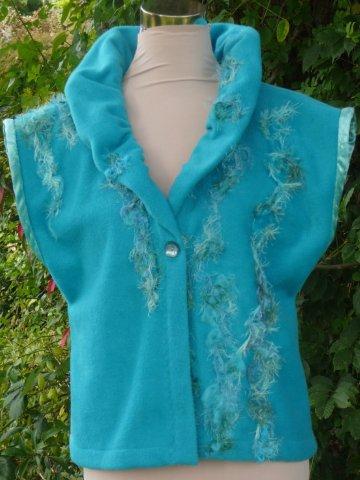 LagunenBlau Aufbruch 40 Stoff:Fleece 100%Polyester gerade geschnittenes Gilet, gekräuselter Kragen mit vielen Tragevarianten, Armabschlüsse mit Pannesamt Strickwolle: Diverse Materialien Grösse 38-42 Länge: 60 weitere Bilder ..... |