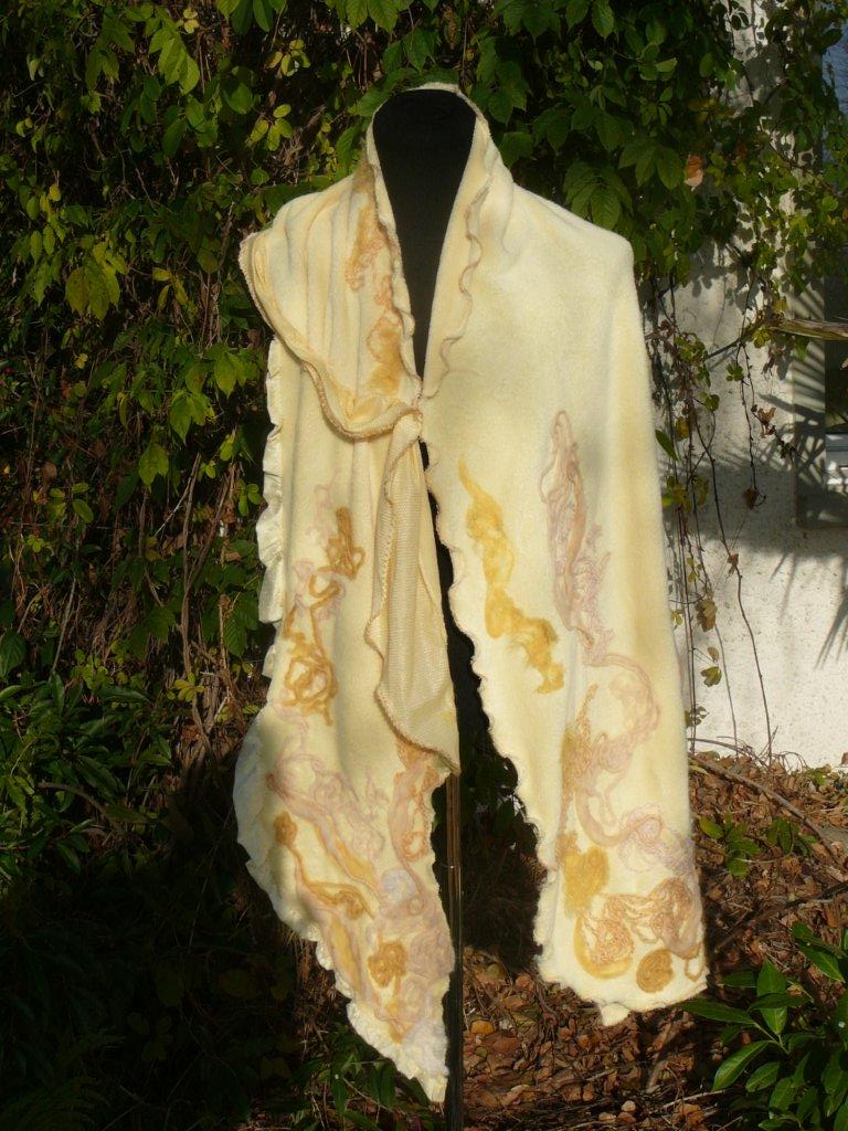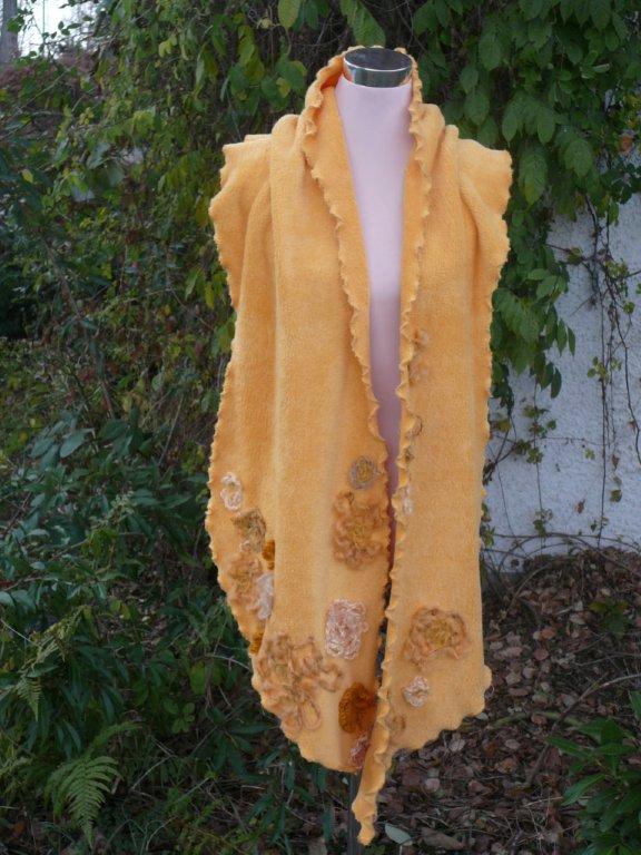 Schal goldgelb Aufbruch 62 Stoff: Fleece, 100% Polyester sehr weich Schal unregelmässig breit in geschwungener Form geschnitten, Kanten gewellt Viele Tragevarianten, mit Ansteckblume zum Drapieren und Fixieren des Schals (Sicherheitsnadel versteckt mit Rose aus Schalstoff) Strickwolle: diverse Materialien Länge: ca. 220 Breite: bis 40 weitere Bilder ..... |
