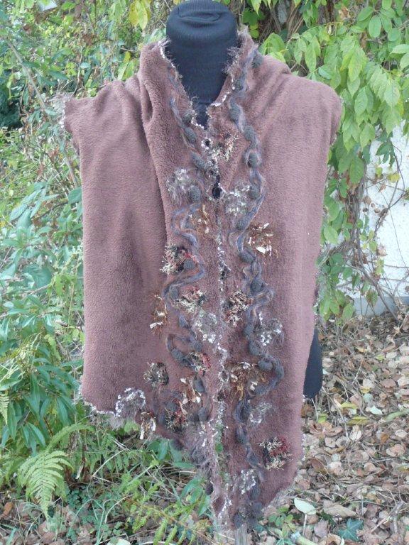 Schal dunkelbraun Aufbruch 59 Stoff: Fleece, 100% Polyester (Tagesdecke) sehr weich Schal unregelmässig breit in geschwungener Form geschnitten, Kanten gewellt Viele Tragevarianten, mit Ansteckblume zum Drapieren und Fixieren des Schals (Sicherheitsnadel versteckt mit Rose aus Schalstoff) Strickwolle: diverse Materialien Länge: ca. 220 Breite: bis 40 weitere Bilder ..... |