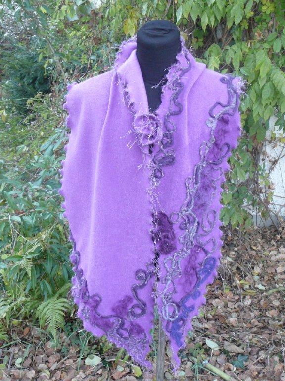 Schal violet Aufbruch 59 Stoff: Fleece, 100% Polyester (Tagesdecke) sehr weich Schal unregelmässig breit in geschwungener Form geschnitten, Kanten gewellt Viele Tragevarianten, mit Ansteckblume zum Drapieren und Fixieren des Schals (Sicherheitsnadel versteckt mit Rose aus Schalstoff) Strickwolle: diverse Materialien Länge: ca. 220 Breite: bis 40 weitere Bilder ..... |