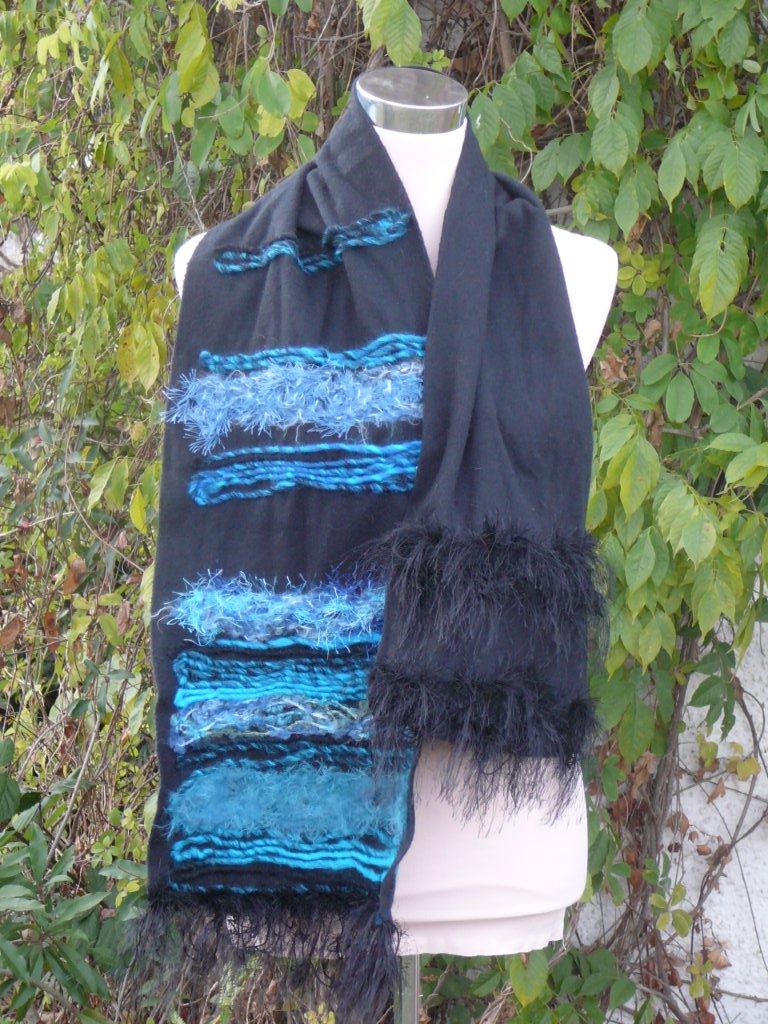 einfacher Schal schwarz blau Aufbruch 63 Stoff: Fleece, 100%Polyester (Tagesdecke) Schal unregelmässig breit geschnitten mit geraden Kanten ohne Abschluss Strickwolle: diverse Materialien Länge: 210 Breite: bis 30 weitere Bilder ..... |