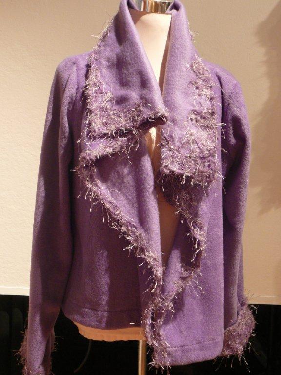 Fliedertraum Aufbruch 66 Stoff: Fleece, 100%Polyester Jacke mit angeschnittenem hohen Kragen, Halspartie und Ärmelstösse sind innen und aussen mit Wollfäden verfilzt, d.h. Kragen/Jacke kann in vielen Varianten getragen werden(hoher Stehkragen, Kragen teilweise umgeklappt, einseitig oder beidseitig offen, Ärmel umgeschlagen oder bis zur Handmitte ...) Mit Ansteckblume zum Drapieren und Fixieren der Vorderteile (Sicherheitsnadel versteckt mit Rose aus Schalstoff) Strickwolle: gemischte Materialien Grösse ca. 40-46 weitere Bilder ..... |